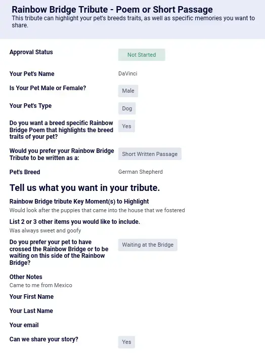 Every tribute begins with a simple form — but every field you fill becomes part of your pet’s story.